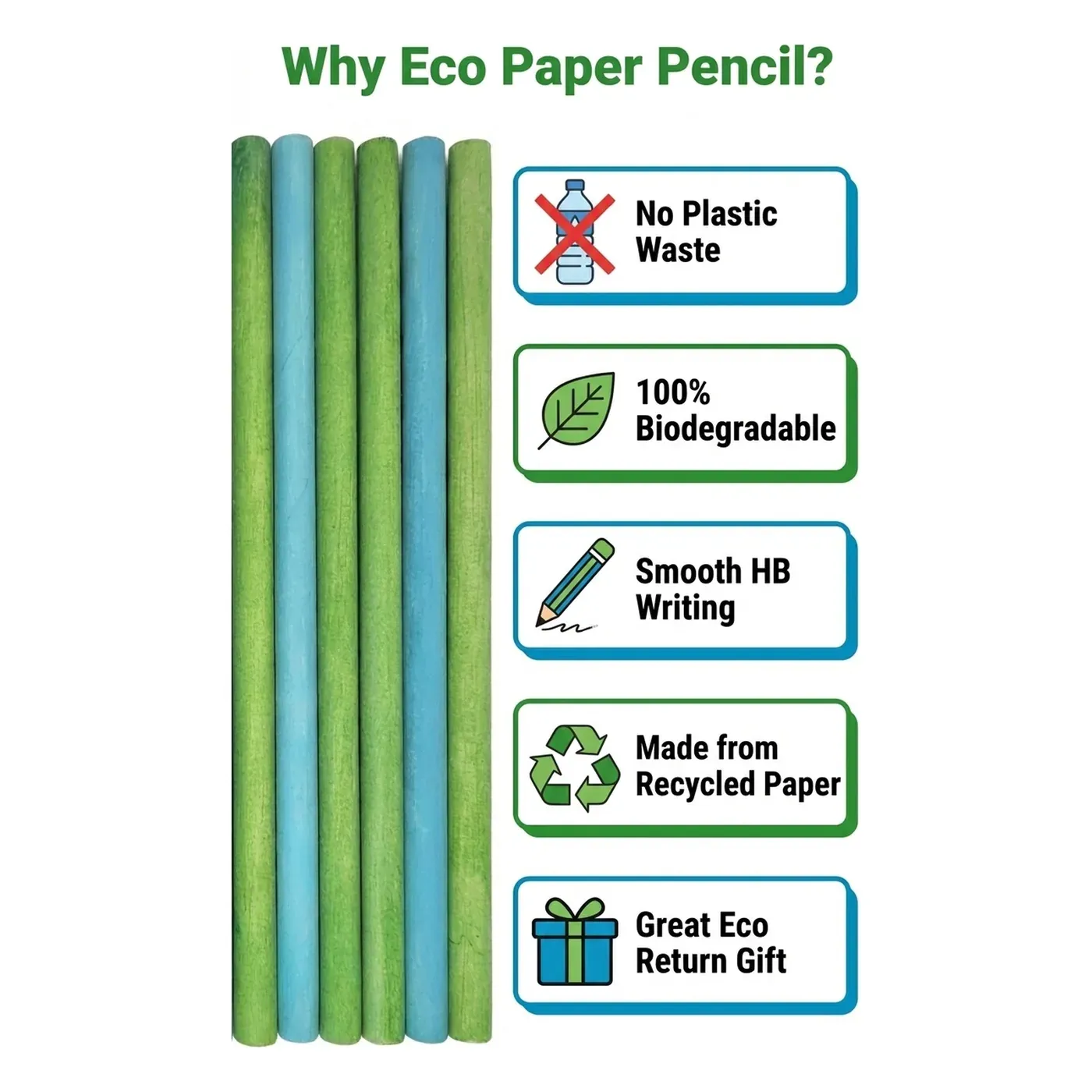 Recycled Paper Pencil Without Seed | Green & Blue Colors | 100% Eco-Friendly Biodegradable HB Pencil | Plastic-Free